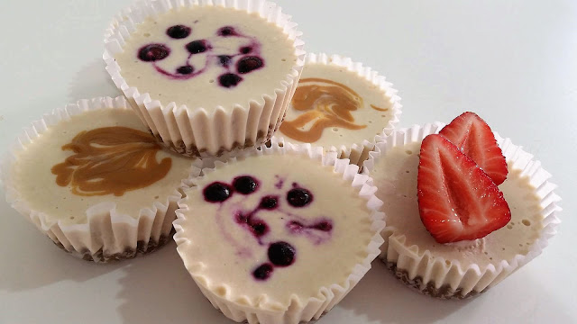- אם רוצים תוספות, זה הזמן. אני פיזרתי על חלק מהעוגות מעט אוכמניות קפואות שהפשרתי כמה דקות לפני (כדי שיצבעו מעט את החלק העליון ויתנו מראה שיש), ובחלק יצרתי דוגמת שיש עם חמאת בוטנים. באותה דרך ניתן לשייש שוקולד מומס או כל ממרח שאוהבים. כמובן שניתן גם להשאיר את העוגות כמו שהן, אז יתקבלו עוגות גבינה "טבעיות" שניתן לקשט בחצי תות או בכל פרי טרי אחר בהגשה.
